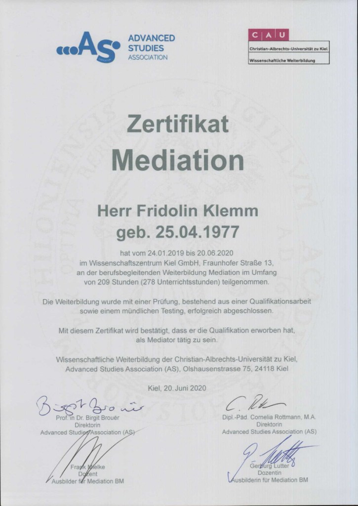 - Ausbildung zum Mediator an der Christian Albrechts Universität zu Kiel nach den Richtlinien des Bundesverbands Mediation.