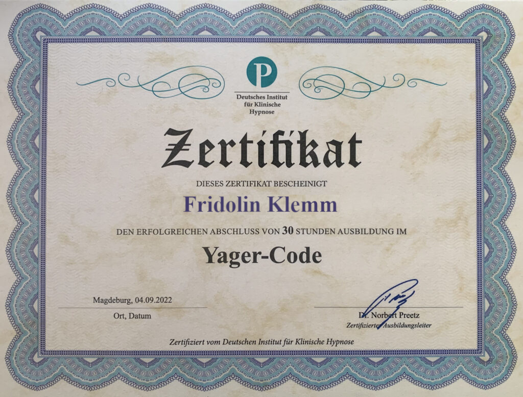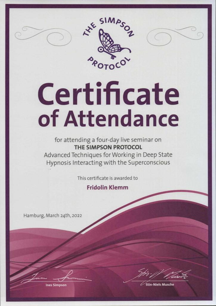 - Fortgeschrittene Arbeit in besonders tiefer Hypnose mit dem Simpson Protokoll an der Hypno School durch Stin-Nils Musche.